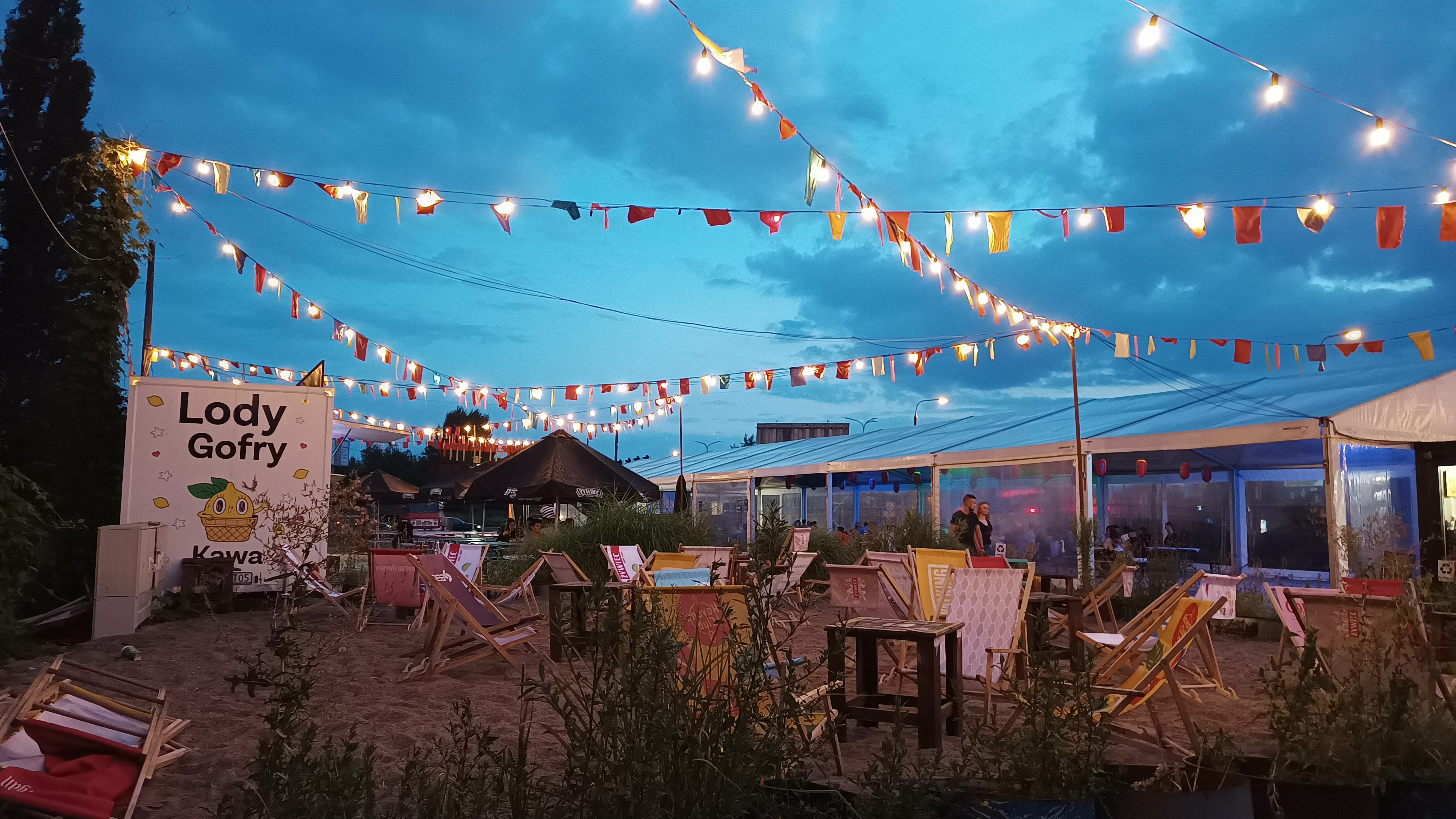 There are food stalls, bars, benches and places to sit, a marquee and a sandy area with deck chairs. Through a slightly unsuspecting fence area, there are more food stalls, benches, graffiti-covered containers housing toilets, and some cool LED light decorations on the rugged brick wall.