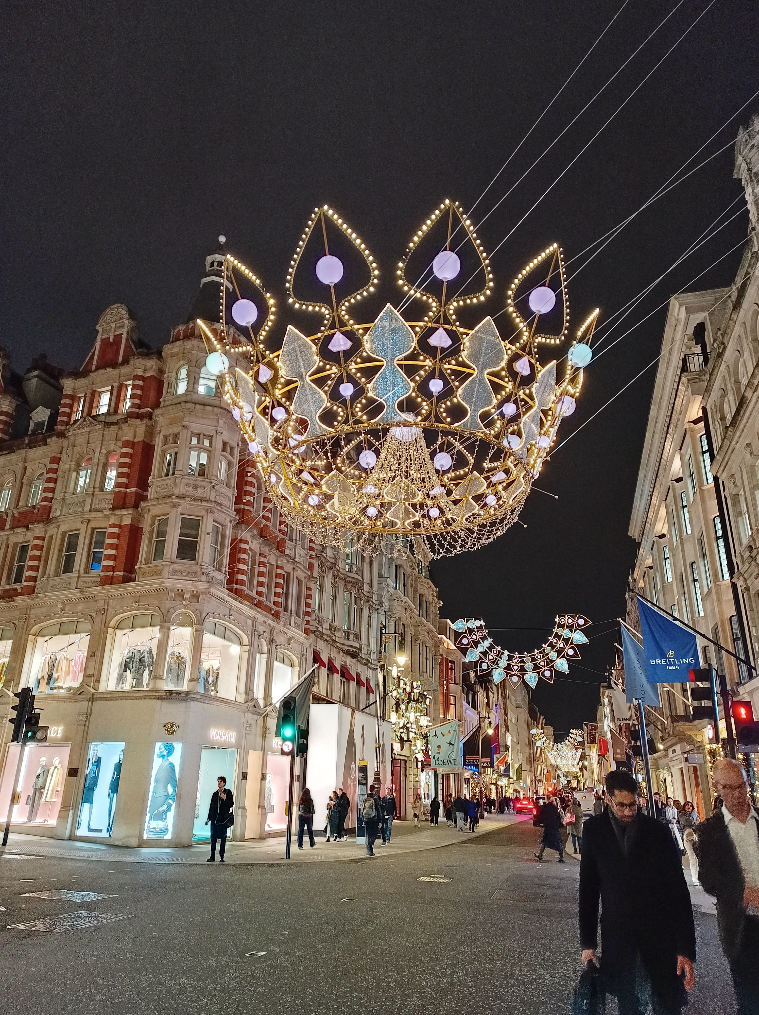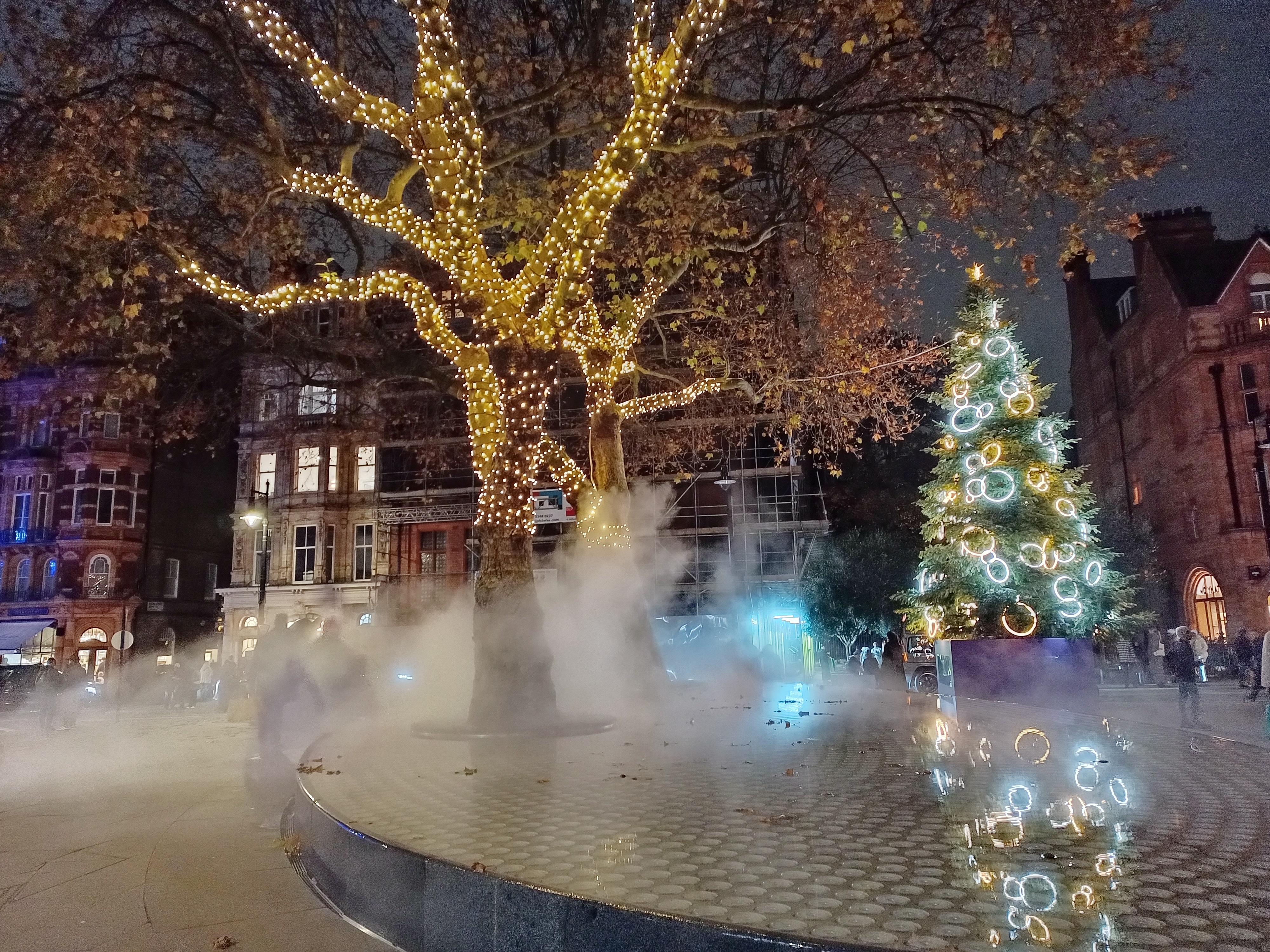 The big blue bows shine brightly and send faint blue hues ricocheting off the period properties. Trees laden with twinkling lights appear to mysteriously emerge from a sea of mist. As the mist dissipates, reflections of a Christmas tree with rings of lights emerge. People snap this magical sight on their phones, the same phones that earlier snapped the giant sparkling crown suspended above a nearby crossroads.